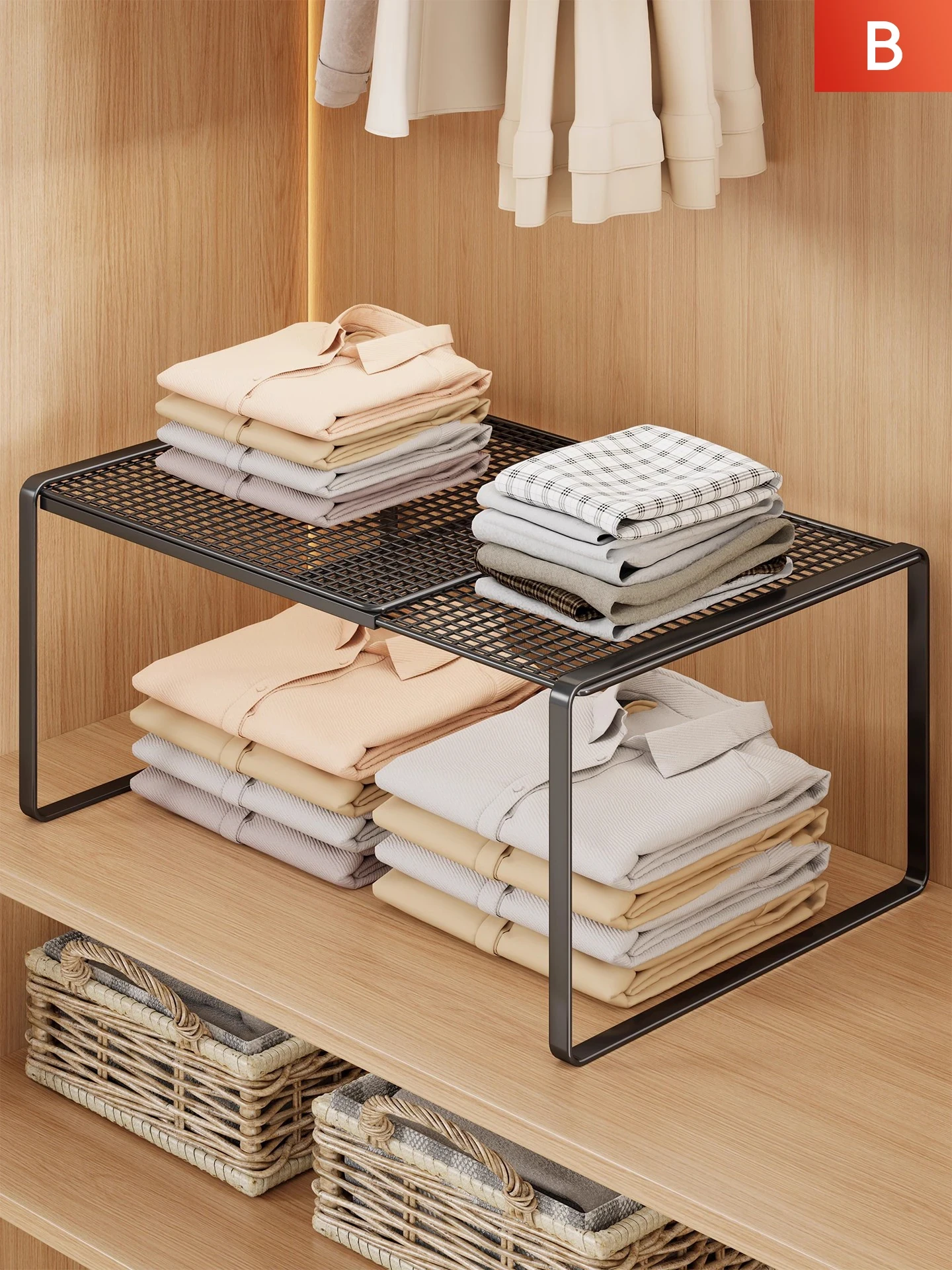 Expandable Closet Organizer with Layered Shelves - No Drilling Required, Perfect for Maximizing Storage Space and Keeping Your Items Neatly Divided! Ideal for Any Cabinet or Surface.