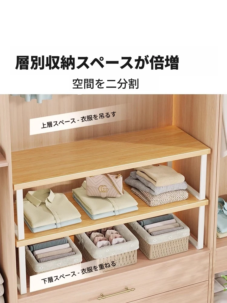衣類収納に最適!クローゼット用分割棚、コンパクトな木製ラック。家の整理整頓に役立つ収納アイテム、使いやすい置き板でスペースを有効活用!