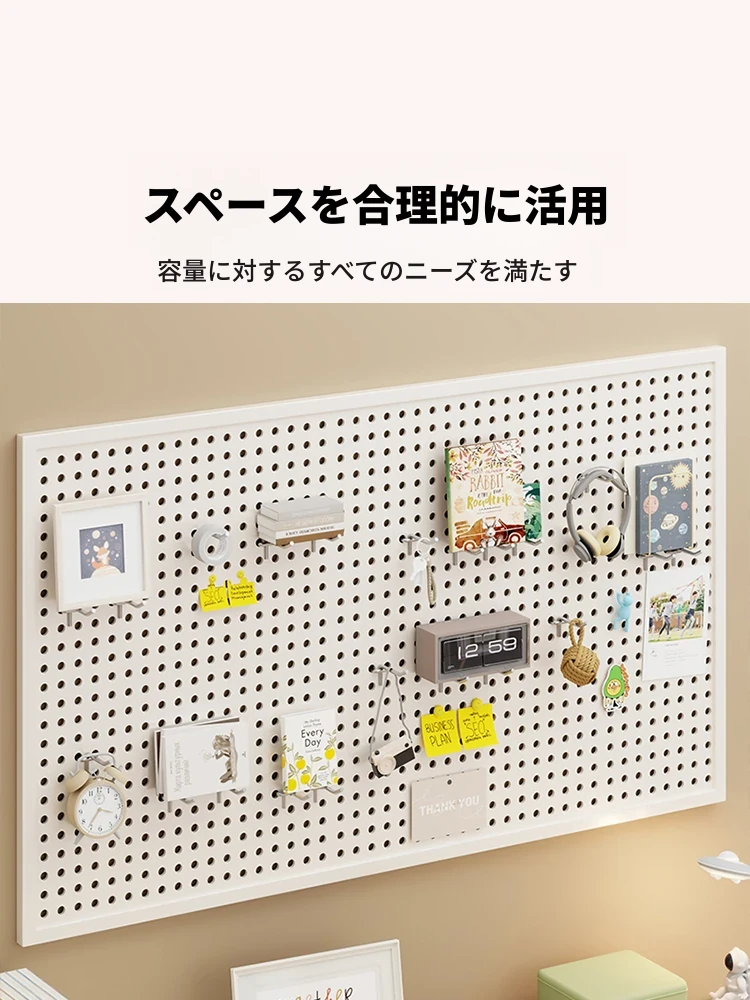 壁に穴を開けずに取り付け可能!スタイリッシュなデザインのデスク用収納ラック。学生寮やおしゃれな部屋にぴったりな金属製パンチングボード展示ラック。アイデア次第で自由自在にスペースを活用!