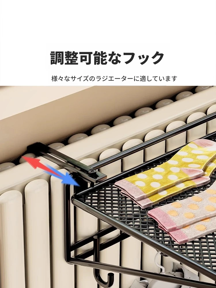 暖房用ハンガーラック!暖房パイプ専用の衣類干しハンガーで、タオルや衣類を効率的に乾かします。スペースを有効活用できる便利な収納フック付き!家族みんなに快適な温かさを。